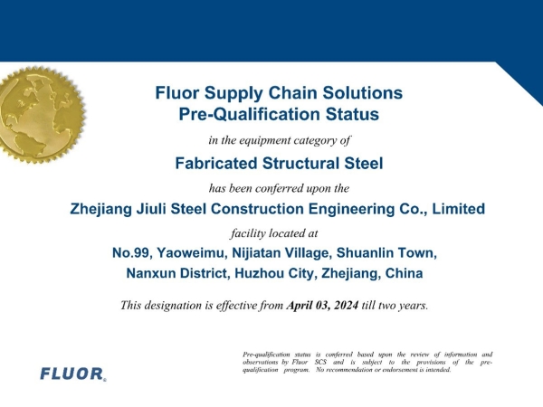 Zhejiang Jiuli Steel Structure Engineering Co., Ltd., founded in February 2001, is based in Huzhou City, the core area of the booming economy of the Yangtze River Delta in China. As a wholly-owned subsidiary of Jiuli Group, our company has not only been awarded honors such as Contract-abiding and Credit-worthy Unit, High-tech Enterprise, and AAA Credit Enterprise in Huzhou City but also holds important memberships in the China Steel Structure Association and the Steel Structure Branch of the Zhejiang Construction Industry Association, demonstrating our authoritative position and outstanding influence in the industry.